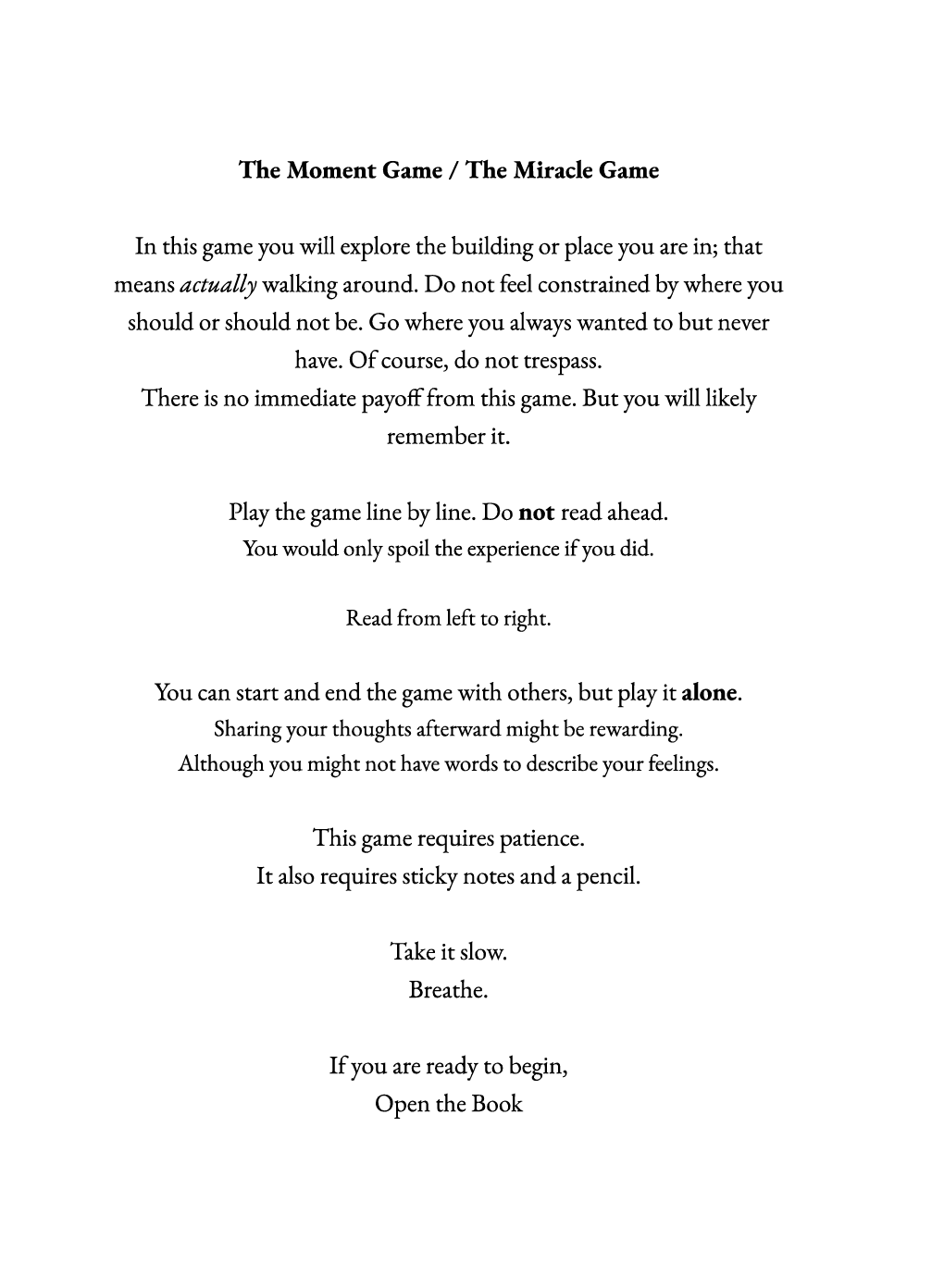 Print the game out double sided and fold in half. Take the leaflet, and a pencil, with you and follow the written instructions. Do NOT read ahead. Hand the leaflet to someone else if you wish.
